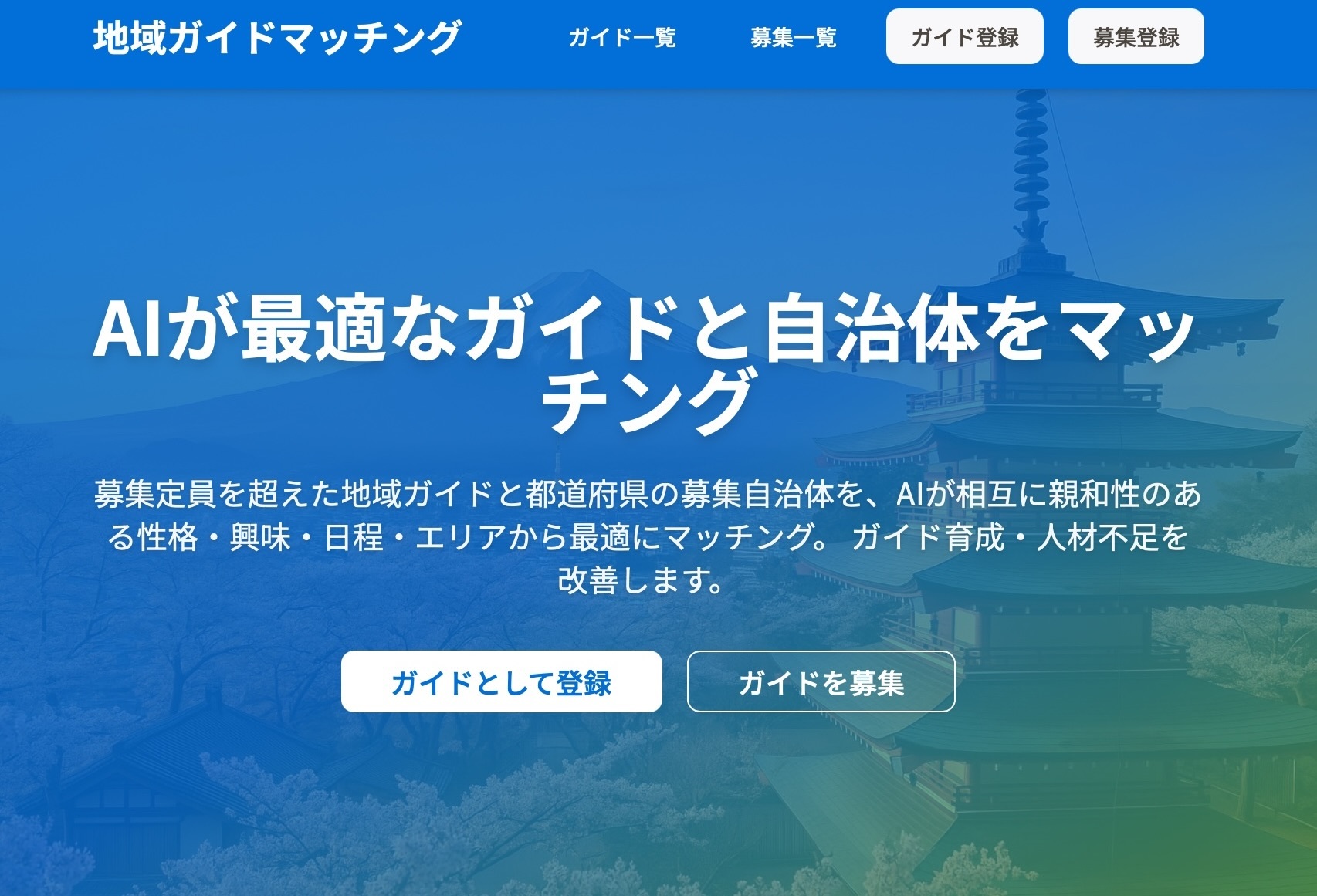 募集定員を超えた地域ガイドと都道府県の募集自治体をマッチング。AIが相互に親和性のある性格・興味・日程・エリアから最適なガイドを提案し、ガイド育成・人材不足を改善する。